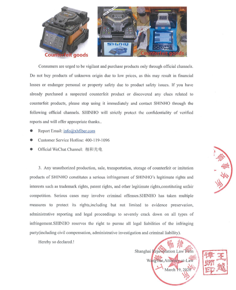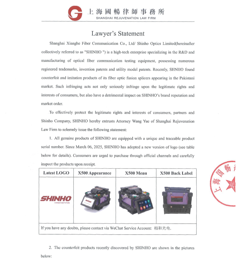 Declaração de um advogado sobre a falsificação da máquina de fusão de fibra óptica SHINHO X-500 no mercado paquistanês.